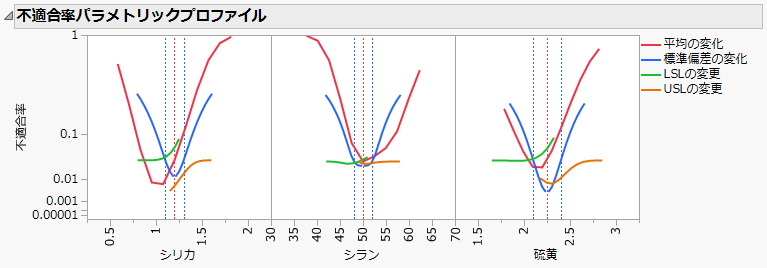 不適合率パラメトリックプロファイルは、因子に対する確率分布の変化が不適合率にどのように影響するかを調べるものです。各因子における確率分布のパラメータが変化したときの影響を調べられます。不適合率パラメトリックプロファイルでは、次の4種類の影響が調べられます。