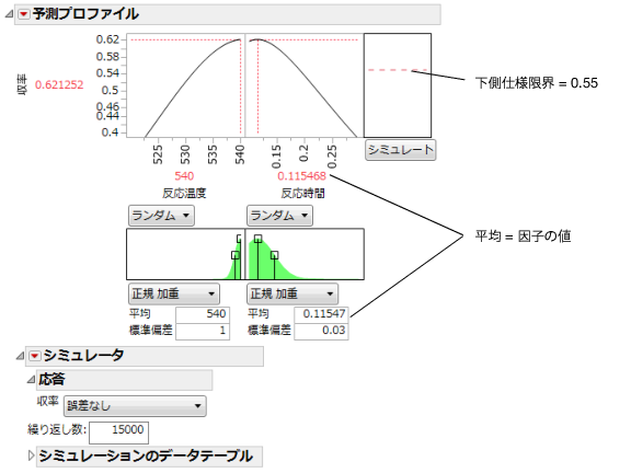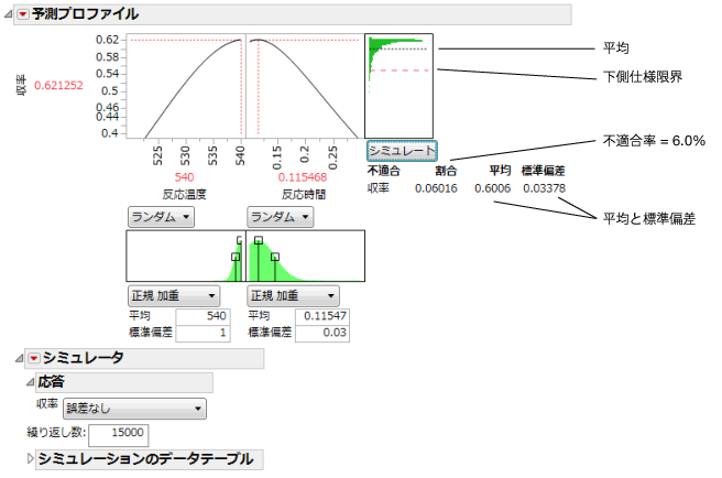 反応温度540と反応時間0.115により予測された「収率」は0.62です。このシミュレーションは温度と時間のばらつきを考慮しました。このシミュレーションでは、不適合率はおよそ6%と推定されました。また、「収率」の標準偏差は0.03であると推定されました。不適合率はおよそ6%ですが、これはおよそ6%の製品が仕様外であることを意味します。