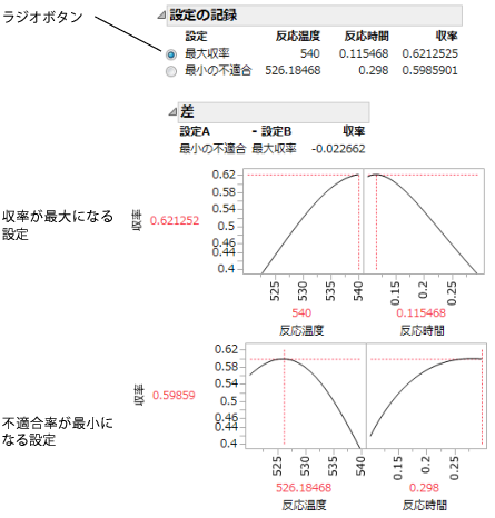 入力因子設定を少々変更することで、予想された収率の減少を0.01未満に抑えながら不適合率を約1.8%に減少させることができます。つまり、因子はばらつかず特定の値に固定できる条件下で「収率」を最大にする最適設定は、因子にばらつきがある条件下で得られた最適設定とは一致しないことがわかります。