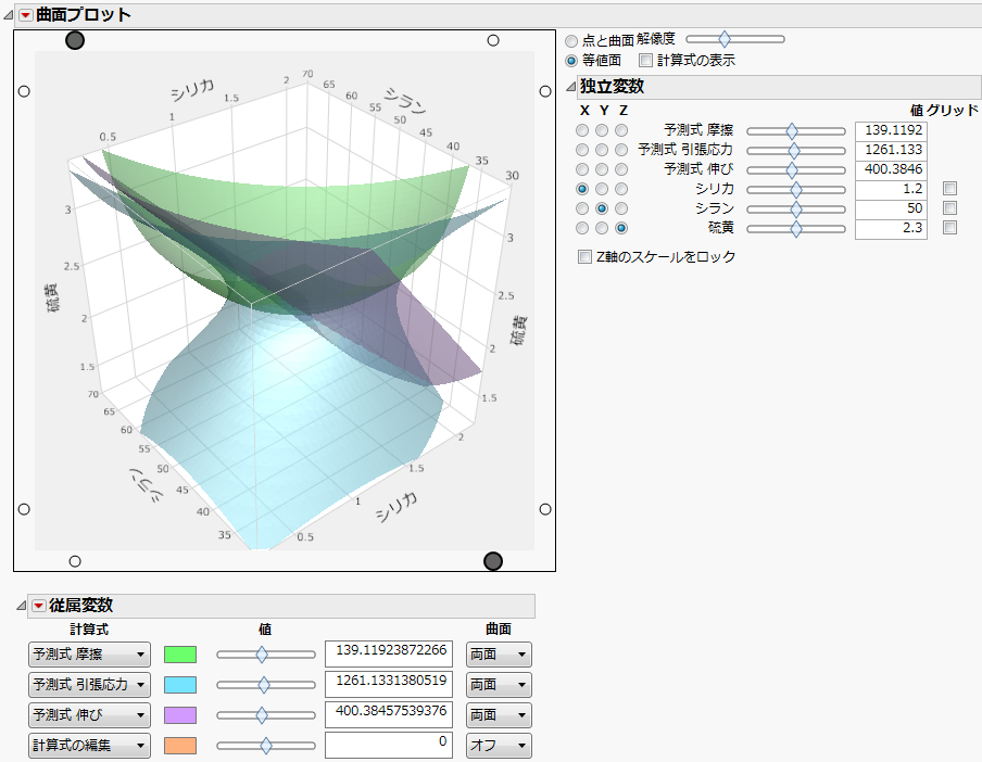「Tiretread」のデータにおいて、「摩擦」はある程度大きく、「伸び」はある程度以上小さいことが望まれているとします。「引張応力」のスライダを動かせば、「引張応力」のどの値が他の2つの曲面によって示される許容範囲内にあるかがわかります。