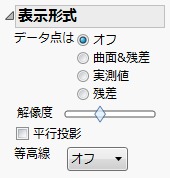 「表示形式」設定パネルのオプションは、モデルのプラットフォームにおける赤い三角ボタンのメニューから[曲面プロファイル]を選択した場合と、「曲面プロット」プラットフォームを単体で起動したときとでは異なります。「表示形式」設定パネルに、モデルのプラットフォームから起動した場合の「表示形式」設定パネルの例を示します。