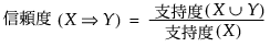 信頼度は、条件アイテム集合を含むトランザクションのうち、帰結アイテム集合を含むものの割合を指します。