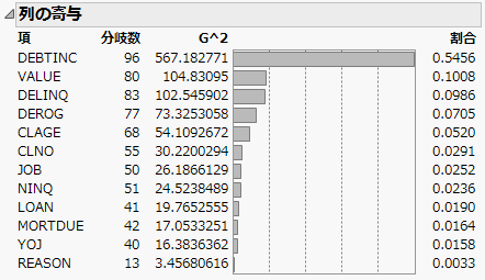 「列の寄与」レポートを見ると、顧客の信用リスクに関する最も強い説明変数は「DEBTINC」であることがわかります。これは、収入に対する債務の比です。その次に大きく寄与しているのは、顧客の評価である「VALUE」や、滞納している支払いの回数である「DELINQ」です。