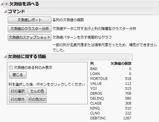 「DEBTINC」列には1267個の欠測値があり、これはオブザベーション数の約21%に相当します。また、その他のほとんどの列にも欠測値があります。先ほどの例では起動ウィンドウにある[欠測値をカテゴリとして扱う]オプションを用いましたが、その場合、これらの欠測値を含んだデータも分析に使われます。詳細については、「パーティション」章の「欠測値をカテゴリとして扱う」(88ページ)を参照してください。