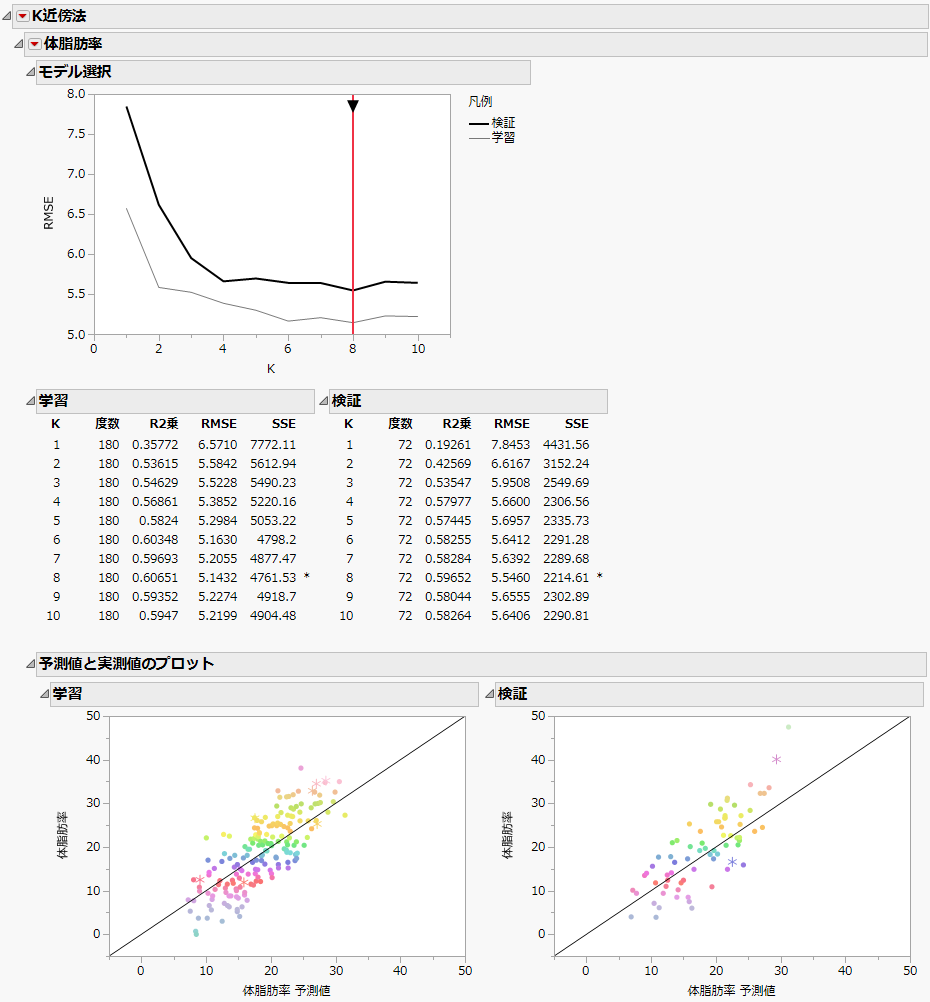 「検証セット」における「RMSE」の値が最も小さくなっているモデルは、K = 8のモデルです。K近傍法モデルのなかでは、8個の近傍点に基づくモデルが最も予測精度が高いようです。学習セットの予測値と実測値のプロットは、予測値が実際の値に類似していることを示す点が直線に沿っており、予測値が実測値に近いことを示しています。検証セットのプロット上のポイントの大部分は直線に沿って分布しますが、上端のオブザベーションのいくつかは少し離れています。