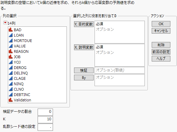 「K近傍法」プラットフォームを起動するには、[分析]>[予測モデル]>[K近傍法]を選択します。