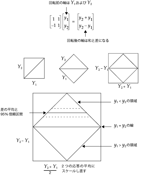 、p. 130)。このグラフは、縦軸の2つの応答と水平軸の2つの応答の平均の差をプロットします。これは、元の2変数の散布図を45度回転させたものと同じです。45度の回転と再スケールによって元の座標軸が差と平均に変換されます。