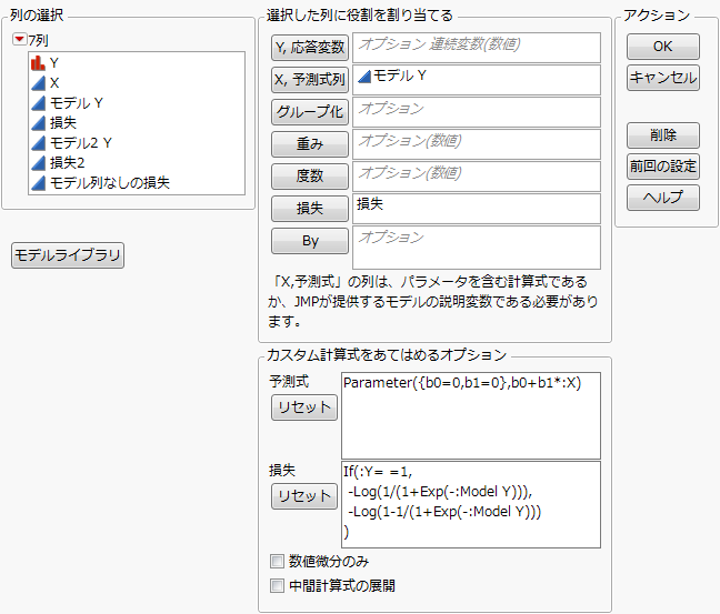 サンプルデータの「Nonlinear Examples」フォルダにある「Logistic w Loss.jmp」データテーブルは、損失関数を使ってロジスティック回帰をあてはめる例です。「Y」列の値は、イベントが発生した場合が「1」、発生しなかった場合が「0」です。「モデル Y」列には線形モデル、「損失」列には損失関数が含まれます。この例の損失関数は、各オブザベーションの負の対数尤度、つまり応答の観測値についてその観測値が得られる確率を計算し、その対数の符号を逆にしたものです。