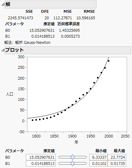 なお、「曲線のあてはめ」プラットフォームには、多項式・ロジスティック曲線・Gompertz曲線・指数モデル・ピークモデル・薬物動態モデルなど、いくつかのモデルがあらかじめ用意されており、それらの非線形回帰モデルに関してはユーザがモデル式を設定する必要はありません。詳細については、「曲線のあてはめ」章(185ページ)を参照してください。