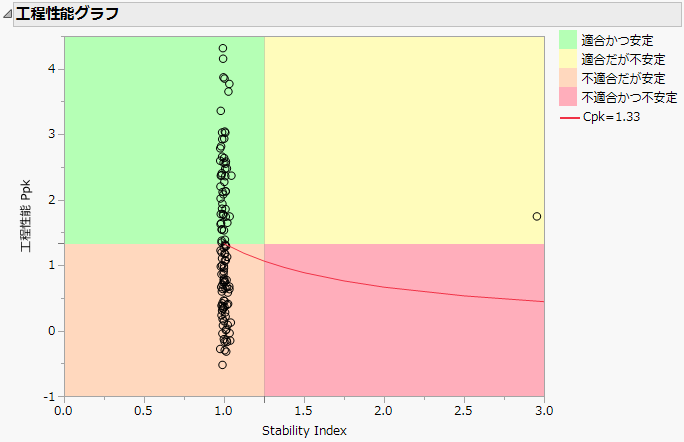 「工程スクリーニング」プラットフォームでは、一定の期間における多数の工程を検討できます。このプラットフォームは、工程の安定性(stability)と工程能力(capability)に関する指標を算出します。また、管理図を描いたり、工程に生じたシフトを検出したりできます。このプラットフォームは、不安定になっている工程、仕様限界に適合していない工程、シフトが生じている工程をすばやく特定でき、工程が多数ある場合でも評価がしやすいです。