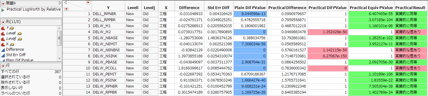 平均の比較に関するデータテーブルには、実質的な差に対する検定と、実質的な同等性に対する検定の結果が含まれています。各行の結果は、カテゴリカルな因子の水準の各ペアにおいて応答を比較したものです。結果は色分けされており、有意性が分かりやすくなっています。実質的な差の指定方法については、第 “Practical Difference”を参照してください。例については、第 “実質的な差や実質的な同等性に対する検定の例”を参照してください。