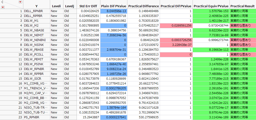 「Plain Dif PValue」列では、「差がゼロである」という帰無仮説に対して有意である応答を確認できます。「Practical Diff PValue」列と「Practical Equiv PValue」列には、実質的な差と実質的な同等性に対する検定のp値が表示されます。多数の比較において、「差がゼロである」という帰無仮説に対する検定には統計的有意差を示しています。しかし、実質的有意差を示しているものは多くありません。