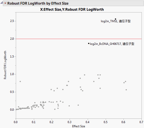 プロットが「Drosophila Aging」データの「Robust LogWorth by Effect Size」のように表示されます。2の位置で引かれた赤い線より上にある点は、有意水準が0.01を下回っています。だいたい1.3のあたりで横に引いた線が、有意水準0.05に対応します。