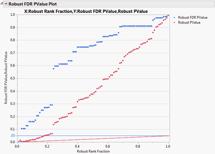 「Drosophila Aging」データの「Robust FDR PValue Plot」は、「Robust FDR PValue Plot」を示しています。ロバスト推定の未調整p値を用いた場合、いくつかの検定で有意差が認められることが、0.05を下回る赤い点の存在で示されています。ただし、ロバスト推定のFDR調整p値を見ると、有意差が認められる検定は2つだけです。