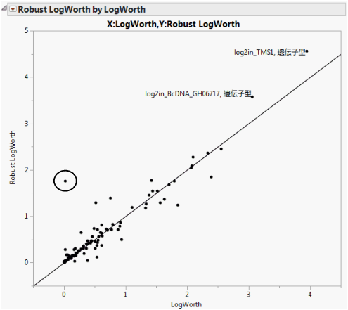「Drosophila Aging」データの「Robust LogWorth by LogWorth」のようなプロットが作成されます。ロバストな検定が通常の検定とまったく同じであれば、「Drosophila Aging」データの「Robust LogWorth by LogWorth」の点は、対角線上に沿ってプロットされます。図で丸く囲まれている点は、「Robust LogWorth」値が「LogWorth」を上回っており、対角線付近に位置していません。