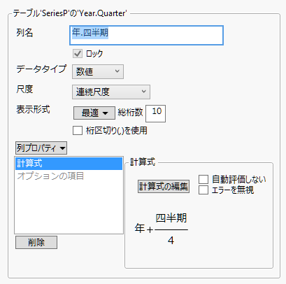 [列]>[列の新規作成]を選択します。「列名」ボックスに、「年.四半期」と入力します。