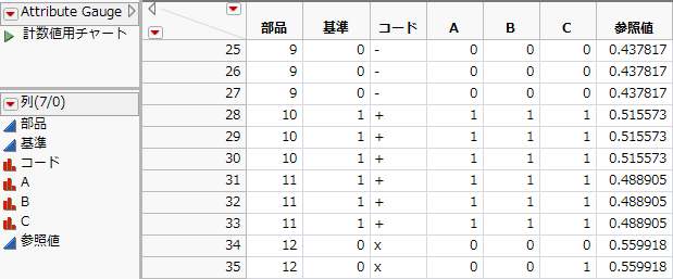 [X, グループ変数]として使用したいその他の変数は、それぞれ1つの列に入れておきます(計数値用ゲージチャートの[部品]列を参照)。[基準]列も定義して、その基準と各判定結果を比較することもできます。基準列と応答列のデータタイプは同じである必要があります。