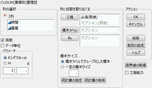 両側CUSUM管理図の場合、Vマスクの原点とVマスクの上下の線との垂直距離(h)を指します(両側CUSUM管理図のVマスクを参照)。片側CUSUM管理図の場合、このHの値は決定限界です。「H」には、標準誤差の何倍にするかを入力します。