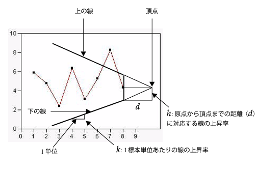 平均がシフトすると、CUSUM管理図上では点の傾きが変化するので、平均がシフトしたことがすぐにわかります。傾きが変化している点がシフトの生じた点です。前にプロットされた点の中にVマスクの上下にはみ出ているものがあるときは、工程が管理外であると判断できます。下の線から点がはみ出ている場合は、平均が上昇していることを示し、上の線から点がはみ出ている場合は、平均が下降していることを示します。