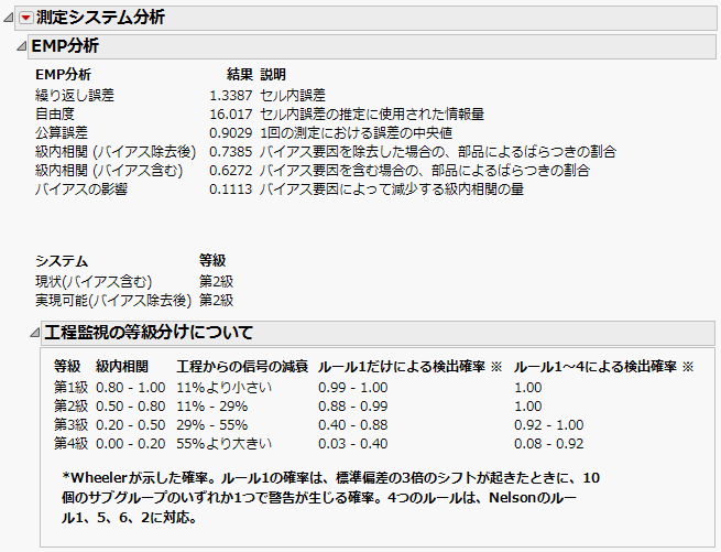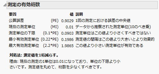 最後に、測定値の桁数が適切かどうかを調べてみましょう。「Yの測定システム分析」の赤い三角ボタンをクリックし、[測定の有効桁数]を選択します。