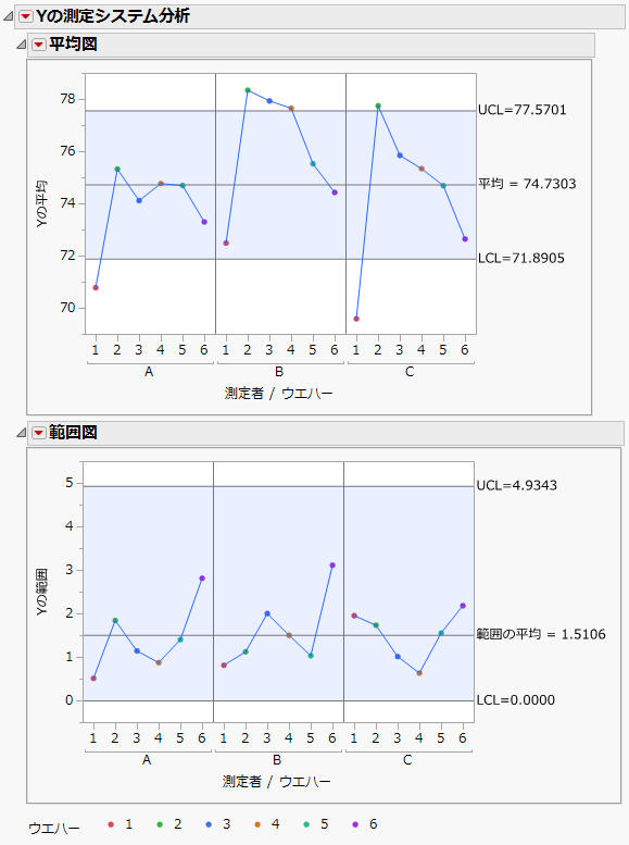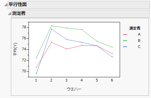 測定者と部品の間の交互作用を調べましょう。「Yの測定システム分析」の赤い三角ボタンをクリックし、[平行性図]を選択します。