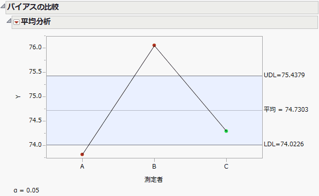 念のため、「バイアスの比較」グラフも見てみましょう。このグラフは、測定者ごとの平均を見て、平均が高すぎたり、低すぎたりしている測定者がいないかを確認できます。「Yの測定システム分析」の赤い三角ボタンをクリックし、[バイアスの比較]を選択します。