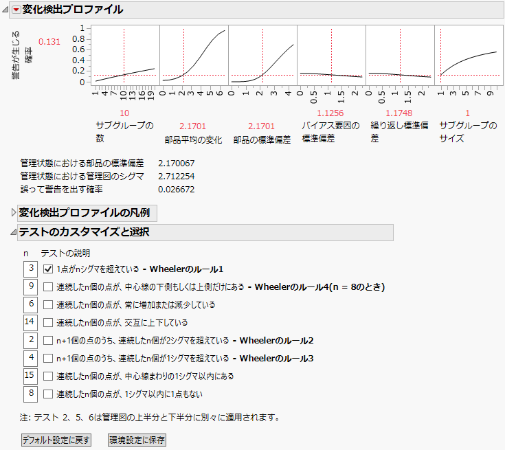 サブグループの標本サイズを増やした場合の効果も調べることができます。サブグループの標本サイズを1より大きくした場合、管理図はXBar管理図になります。「バイアス要因の標準偏差」の値を1.1256に戻し、1つ目のテストだけが選択されている状態に戻してください。そして、プロファイルの「サブグループのサイズ」を4に設定してください。部品の標準偏差の2倍だけ平均がシフトしたとき、そのシフトをこの設定で検出する確率は98.5%となります。