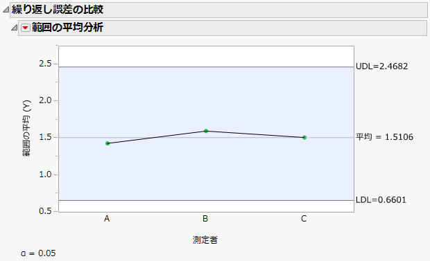 測定者ごとに見られるばらつきについて、さらに詳しく検討しましょう。「Yの測定システム分析」の赤い三角ボタンをクリックし、[繰り返し誤差の比較]を選択します。