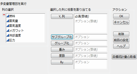 このボタンをクリックすると、工程の過去のデータから計算した目標値が保存されているJMPデータテーブルを選択できます。