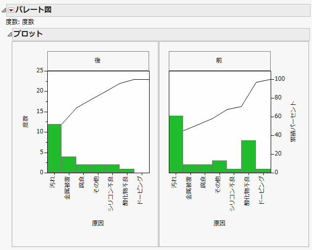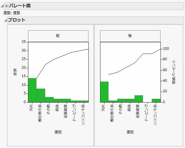 2つの図を比較すると、洗浄後に「酸化物不良」が減少していることがわかりますが、 図がセルの順序を変更した1元層別パレート図のように「前」と「後」という自然な順序で並んでいた方が(同時に「原因」もそれに合わせて並べられた方が)、解釈はより簡単になります。原因は、左側の図における度数の降順で並べられる点に注意してください。