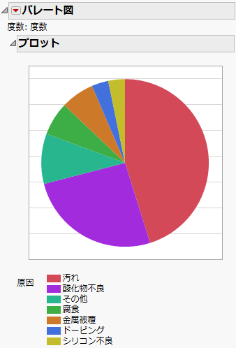 この例で使用する「Failure.jmp」サンプルデータは、「度数」の列がある不適合のデータであり、 集積回路(IC)の製造工程で生じる不適合の原因と、不適合が生じた回数を種類別にまとめたものです。ここでは、工程に不適合を生じさせる一番の原因を探し出します。