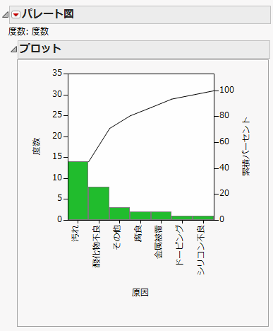 パレート図を作成できるのは、Y変数(原因の変数)が1つ、X変数(分類変数)が0~2個あるときです。 変数が数値か文字列かの区別も、尺度の区別もなく、 すべての値が離散変数として扱われ、棒グラフの棒は度数およびパーセントを表します。パレート図は、次のような構成になっています。