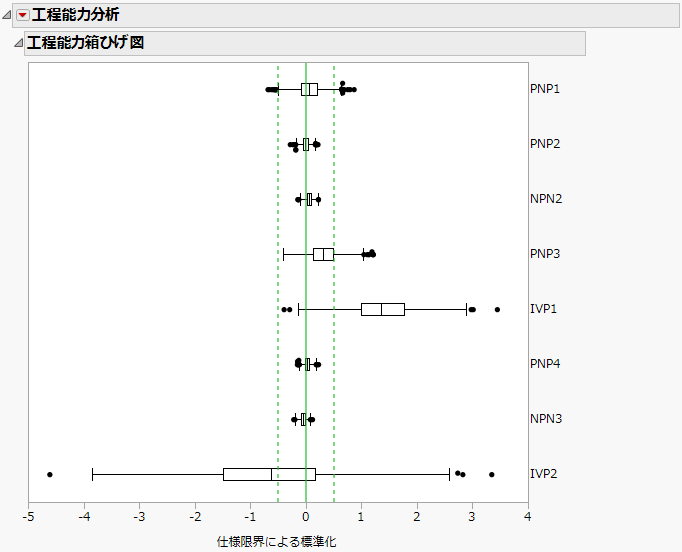 このプロットでは、各変数をその仕様限界と比較することができます。たとえば、工程能力箱ひげ図の「IVP1」では、点の大部分が上側仕様限界を超えていますが、「IVP2」を見ると、大部分が目標値を下回っています。「PNP2」は、すべての点が仕様限界内に収まっていることから、目標に達していると考えられます。