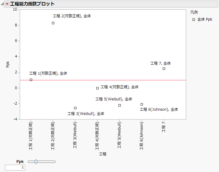 非正規分布を使った工程能力指数プロットは、「Process Measurements.jmp」サンプルデータの「工程能力指数プロット」レポートです。変数のうち7つが非正規分布であてはめられています。「工程 7」は、正規分布であてはめられています。「工程能力指数プロット」の赤い三角ボタンのメニューにある[全体シグマの点にラベル]オプションを使い、点にラベルを付けています。