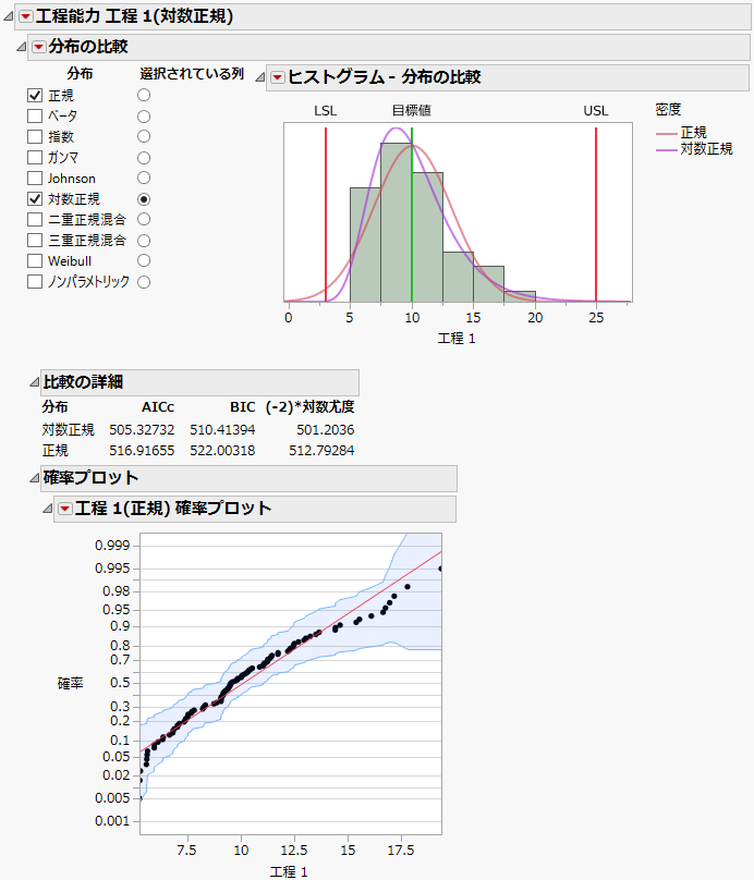 正規分布の確率プロットを表示した「分布の比較」は、「Process Measurements.jmp」サンプルデータの「工程 1」の「分布の比較」レポートです。対数正規分布が選択されており、正規分布と比較されています。「比較の詳細」レポートには、両確率分布の適合度統計量が表示されます。