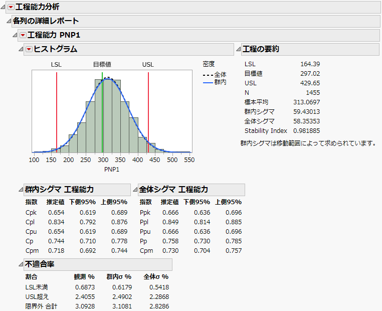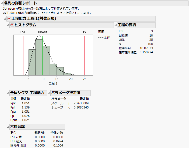 さらに、パラメトリックな非正規分布を選択した場合は「パラメータ推定値」、ノンパラメトリックな分布を選択した場合は「ノンパラメトリック密度」レポートが表示されます。第 “パラメータ推定値”および第 “ノンパラメトリック密度”を参照してください。
