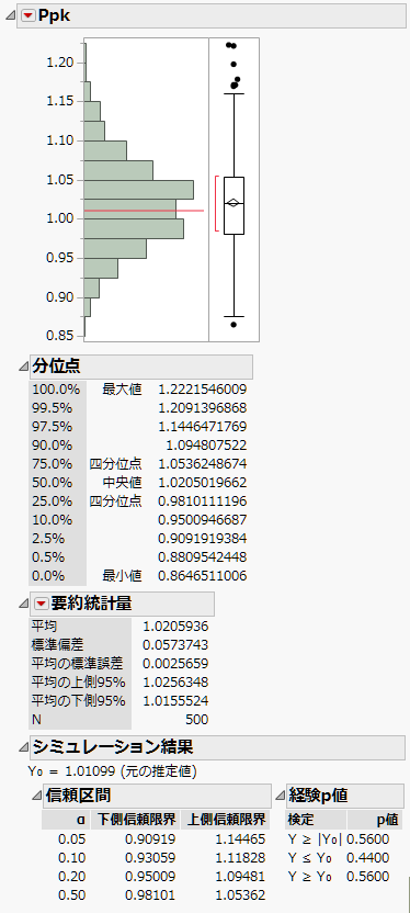 「シミュレーションの結果」レポートを見ると、Ppkの95%信頼区間は0.909~1.145です。真のPpkの値は、1.0より大きい可能性は否定できません。つまり、「純度」に対する結果は、第 “非正規分布の工程能力分析”で作成した「工程能力指数プロット」のPpk = 1の線より上に位置しているのかもしれません。
