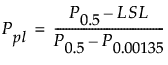 ここで、工程には下側仕様限界(LSL)と上側仕様限界(USL)が指定されており、その非正規分布の分布関数をFとします。標準正規分布のスケールに変換した仕様限界を次のように定義します。