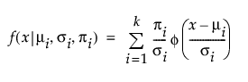 は、標準正規分布の確率密度関数です。二重正規混合分布では、kは2です。三重正規混合分布では、kは3です。各正規分布の平均と標準偏差、および、全体に対する割合を推定します。