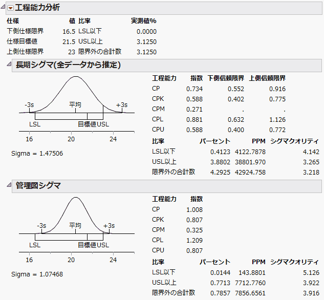工程能力分析の詳細については、『基本的な統計分析』の「一変量の分布」章を参照してください。