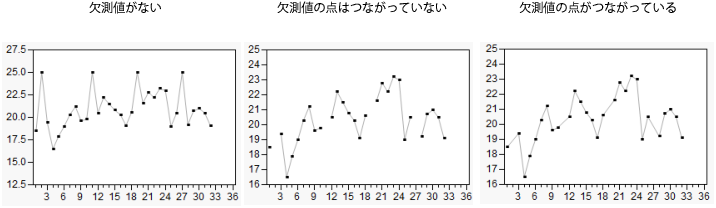 欠測値となっている標本があっても点を直線でつなぎます。[欠測値をつなぐ]オプションの例の左側の管理図は、欠測値となっている標本がない管理図です。中央の管理図では、番号が2, 11, 19, 27である標本欠測値となっているのですが、これらの点はつながれていません。右側の管理図では、[欠測値をつなぐ]オプションが選択されています(デフォルトの設定)。