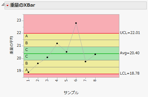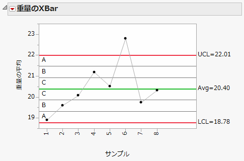 ゾーンの線の表示/非表示を切り替えます。ゾーンにはA・B・Cというラベルがついています(図は、「Coating.jmp」データの「重量」をプロットしたXbar管理図です)。ゾーンの線がテストでの境界線となります。中心線の上下に、それぞれ1σの間隔をあけて3本ずつ線が引かれ、それらで3つのゾーンに分けられます。