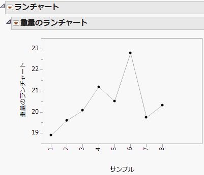 ランチャートは、データを折れ線によって描きます。次の例は、サンプルデータフォルダ内の「Quality Control」フォルダにある「Coating.jmp」サンプルデータ(出典は、『ASTM Manual on Presentation of Data and Control Chart Analysis』)の「重量」変数を使ったランチャートです。