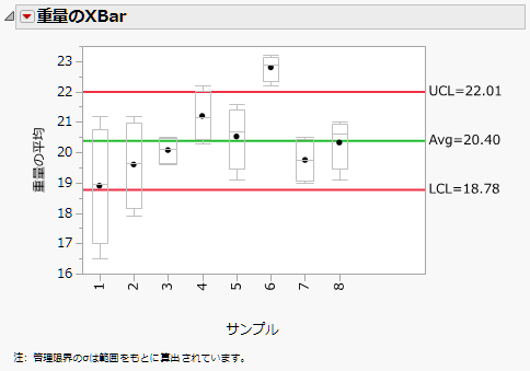 「重量」のXBar管理図で右クリックし、[チャートオプション]>[箱ひげ図]を選択します。