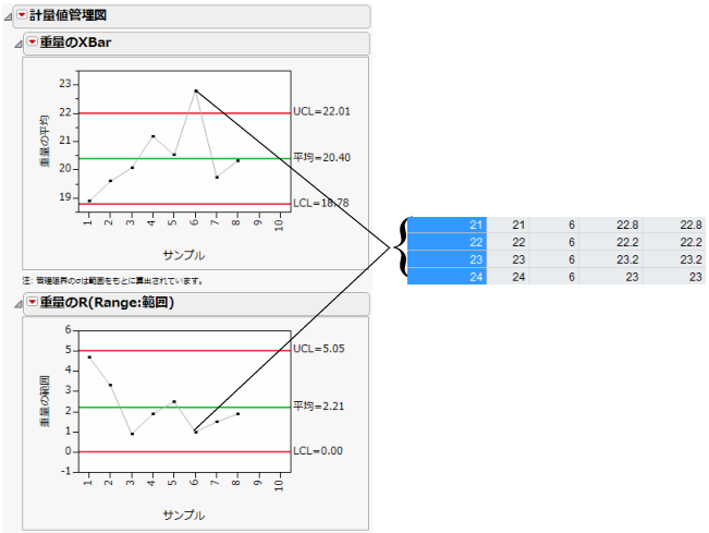 次の例では、「Coating.jmp」データテーブルを使います。分析対象となる品質特性は「重量」列で、 サブグループの標本サイズは4に設定してあります。工程のX̅-R管理図は「Coating」データの計量値管理図のようになります。