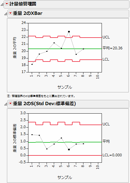 データの「重量2」列にはいくつか欠測値があるため、管理限界の値が一定ではありません。どのサンプルもオブザベーションの数は同じですが、サンプル1, 3, 5, 7には欠測値が含まれています。