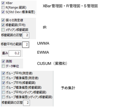 [IR]を選択すると、「個々の測定値」・「移動範囲」・「メディアン移動範囲」管理図のチェックボックスが表示されます。