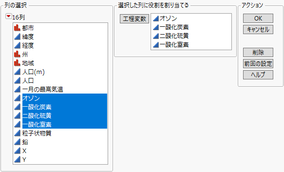 [ヘルプ]>[サンプルデータライブラリ]を選択し、「Cities.jmp」を開きます。