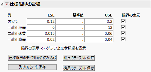 このオプション選択すると、それらの列のグラフを作成したときに、仕様限界の参照線がグラフに描かれます。特定の列にだけ仕様限界の参照線を描きたい場合は、その列の横にある[限界の表示]チェックボックスだけをオンにします。