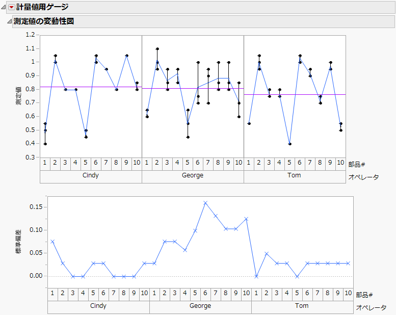 計量値用ゲージチャートでは、連続尺度の測定値を分析し、測定システムの測定精度を調べることができます。なお、このプラットフォームは、測定システムだけではなく、一般的なデータに見られるばらつきを調べることもできます。